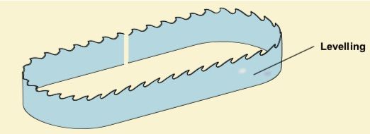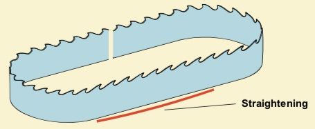 In order to straighten a saw blade, the top of the band saw blade is given a slightly convex curve in order to compensate for the elongation of the toothed side while the saw is in action. Re-grinding of the tooth gullet also has the effect of extending the tooth gullet line in relation to the back, which makes it necessary to dress the blade again. The condition of the saw blade is checked by placing an approx. 1.5 m long straightedge along the top. If an irregularity is detected, it is marked with chalk lines. The blade top is inspected over its entire length, and the various errors are eliminated as described below.