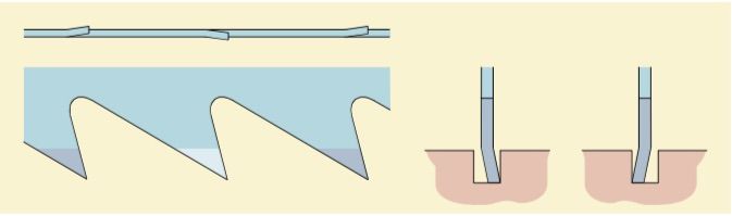 The swaging process shapes the tooth tip so that it is conical towards the bottom and tapered towards the back. Since the swage saw tooth acts across the entire kerf width, it has to do the same job as two teeth in a set saw blade. The greater number of major and minor cutting edges ensures a higher cutting output.