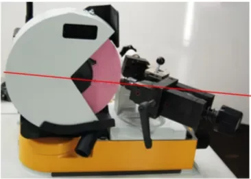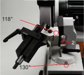 Attach the rotating diamond cutter to the base set at 118º. Clamp with the star knob set to A. Set the rake angle to 3.5 and the clamping jaw support to 0.