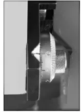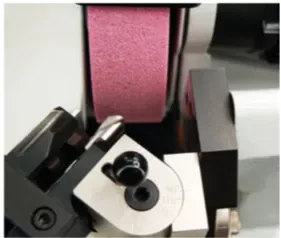 Move the prism feed towards the grinding wheel until the diamond gently touches the grinding wheel and starts to rotate. Now move the motor feed to the left or right until the grinding wheel is clean and sharp again.