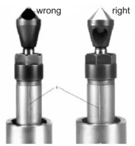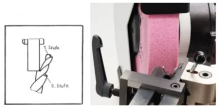 The step cam (optional) is required for sharpening countersinks. The adjustment is made as shown in the following figure (the left is incorrect and the right is correct.