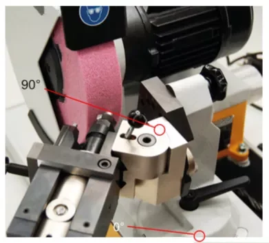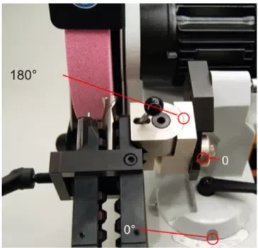 The clamping prism must be set at 90º. Now place the countersink in the clamp of the countersink sharpening stand and align the cutting edge as shown in the following photo, on the graduated line.