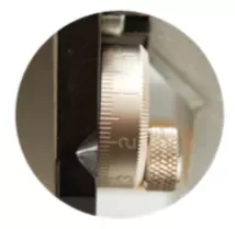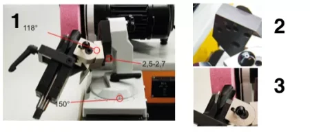 Attach the gyroscope to the prism, set the prism holder to 118°, secure it with the fixing screw in hole A. Turn the clearance angle adjustment to position 3.5. The prism rests at 0. Move the prism feed towards the grinding wheel, so that the diamond touches the grinding wheel and starts to rotate. Move the motor feed with the grinding wheel left and right, clean and adjust the grinding wheel.