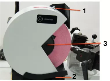Open the two screws 1 and 2 of the guard with a 10 mm spanner. Remove the guard from the grinding wheel.